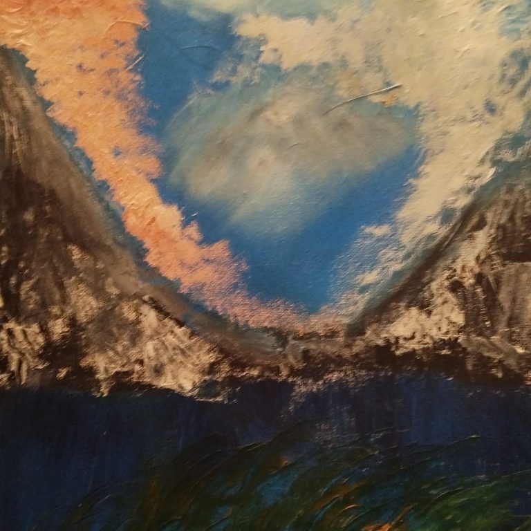 Above the tree and the mountain, a dancing couple appears in the clouds – a fleeting figure of connection inside a turbulent landscape.