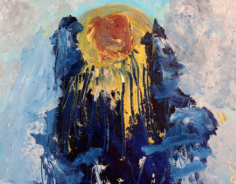Mountains turn into states, beings turn into questions, and the sky is not an “above” but an opened inner space